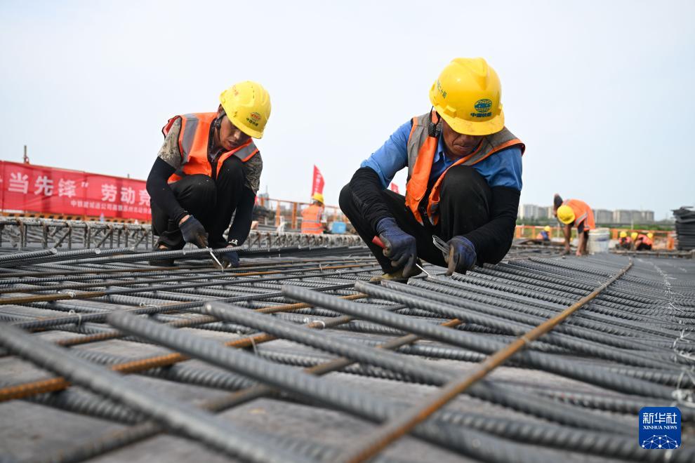 8月6日,中鐵建城通公司工人在施工現(xiàn)場綁扎鋼筋。