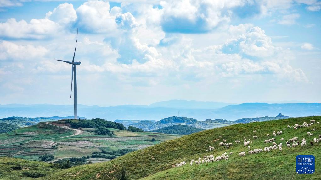 威寧彝族回族苗族自治縣雪山鎮(zhèn)村民飼養(yǎng)的羊群在風(fēng)力發(fā)電設(shè)施下的草場(chǎng)吃草(2023年7月13日攝)。