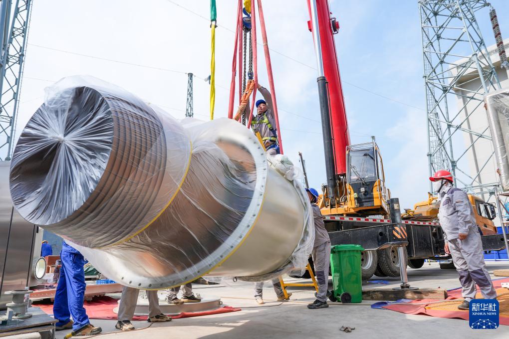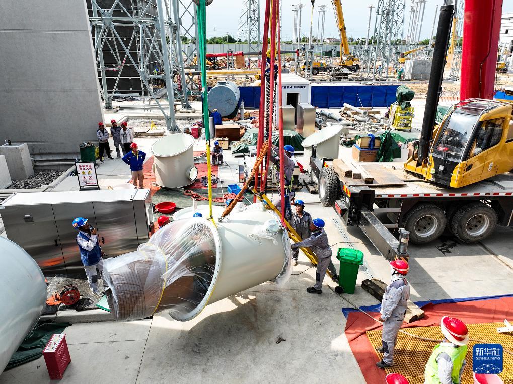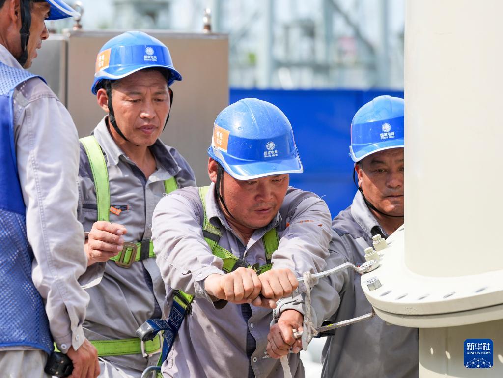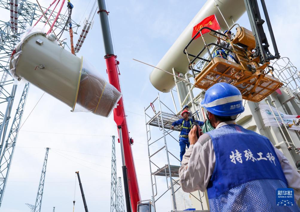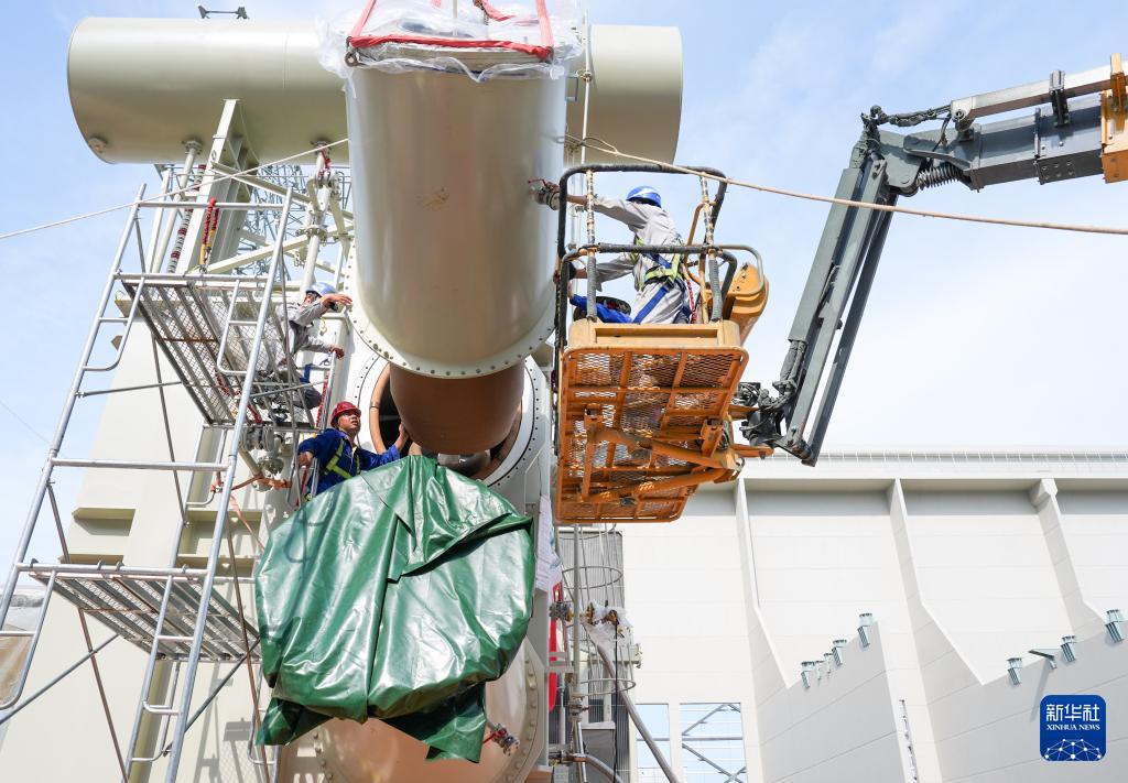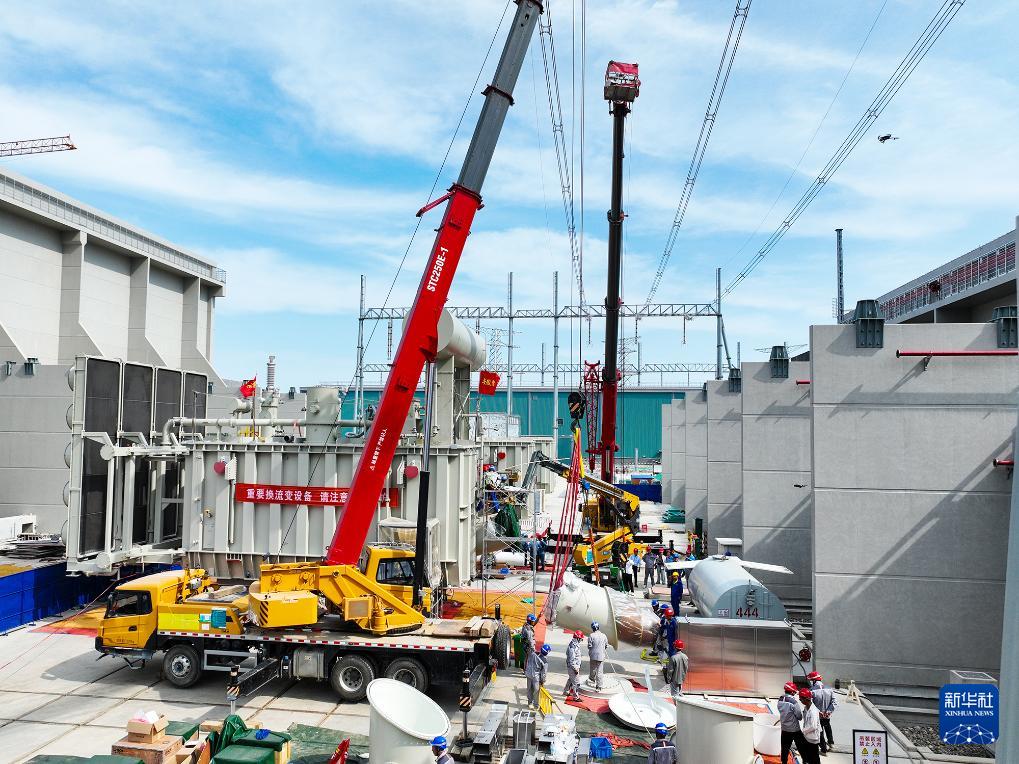 8月6日,在位于安徽省廬江縣的合州換流站,安徽送變電工程有限公司施工人員在進行換流變壓器安裝作業(yè)。