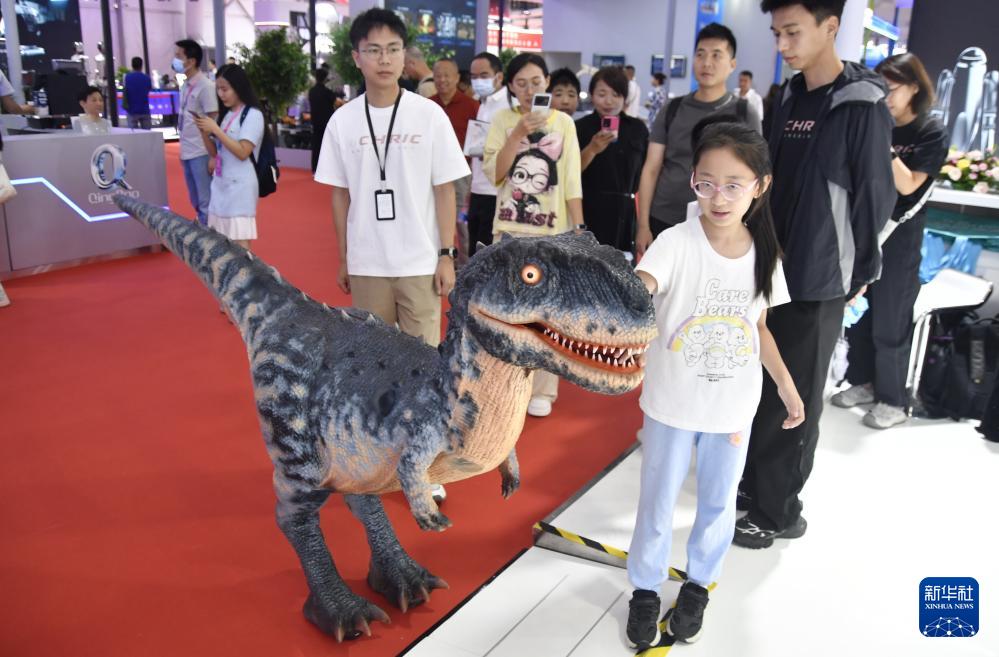 8月8日,觀眾在2025世界機器人大會現(xiàn)場與展出的仿真恐龍互動。