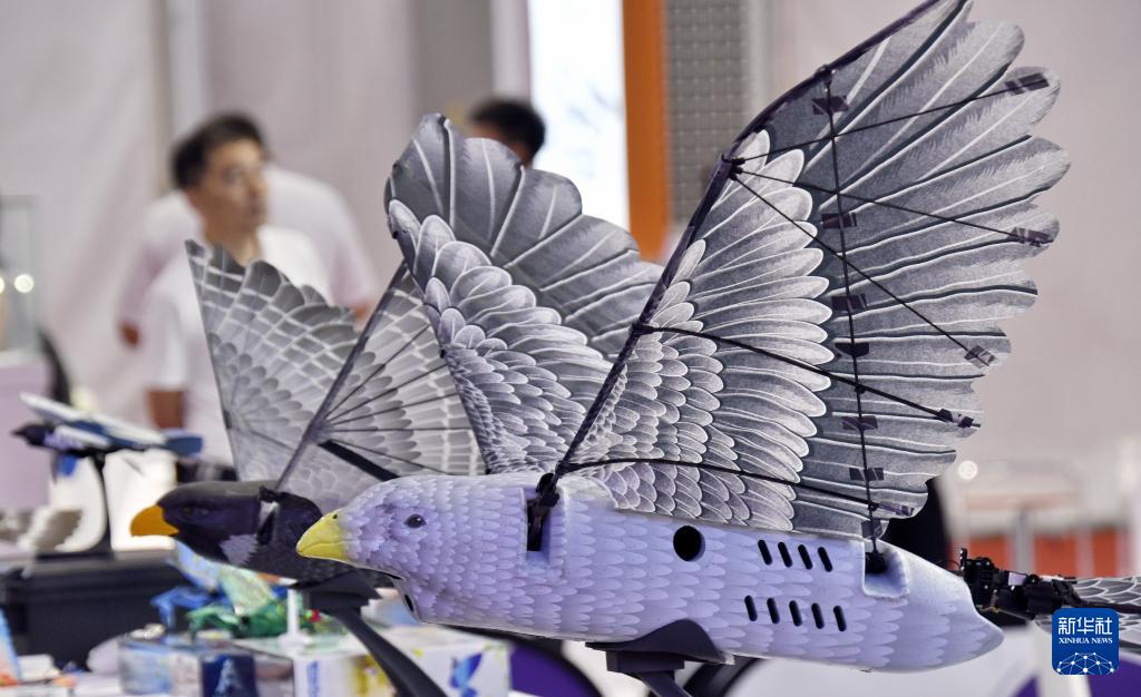 這是8月8日拍攝的2025世界機器人大會上展出的仿真飛禽。