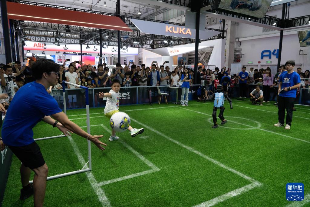 8月8日,觀眾在2025世界機器人大會上與機器人踢足球。