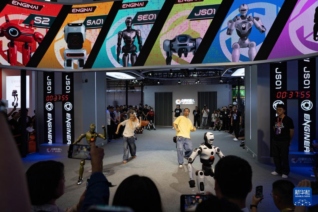 8月8日,工作人員和機器人在2025世界機器人大會上一同跳街舞。