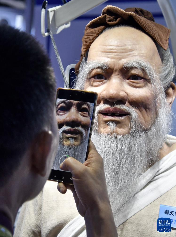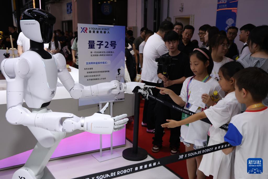8月8日,觀眾在2025世界機器人大會上與一款最新發(fā)布的“量子2號”機器人互動。