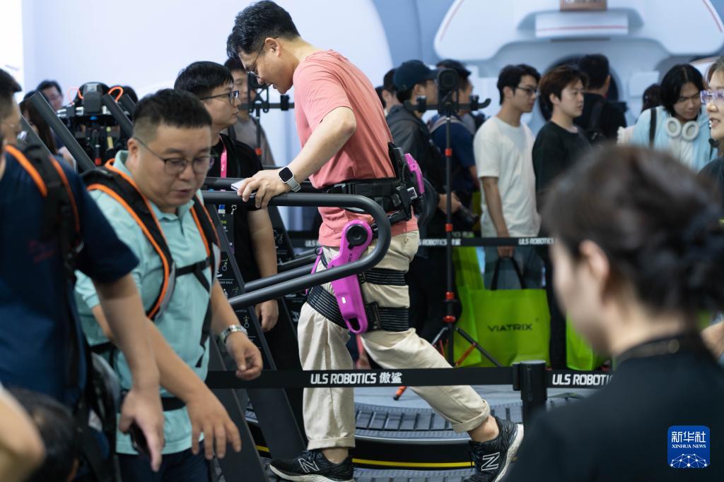 8月8日,觀眾在2025世界機器人大會上體驗一款外骨骼機器人。