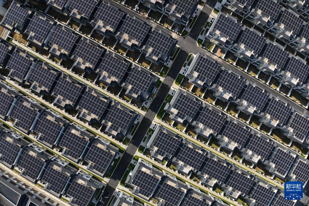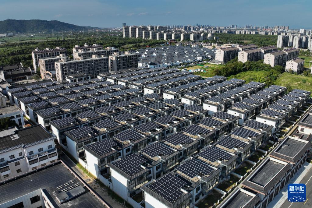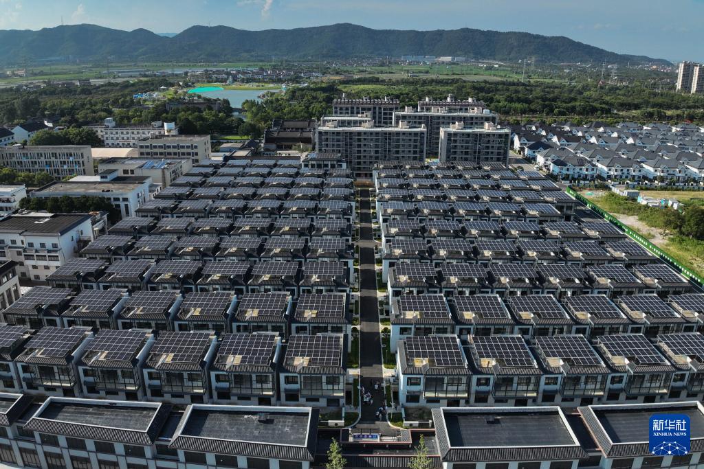 8月12日拍攝的寧波奉化蕭王廟街道滕頭未來社區(qū)屋頂分布式光伏發(fā)電項(xiàng)目(無人機(jī)照片)。