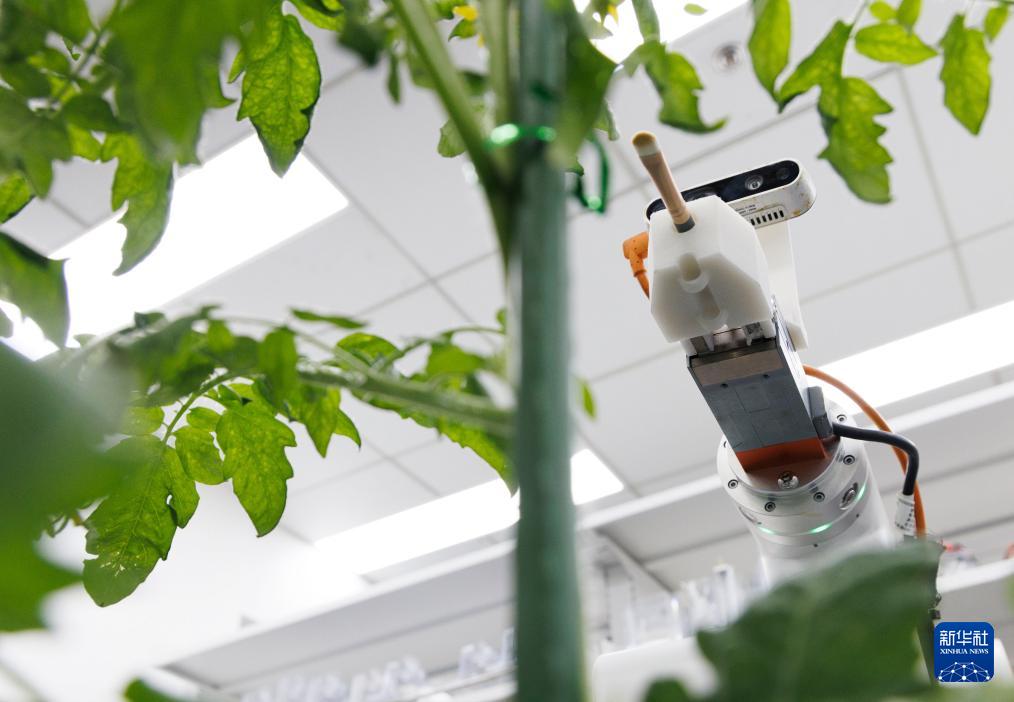 智能育種機(jī)器人“吉兒”在位于北京的一個(gè)現(xiàn)代化商業(yè)溫室中進(jìn)行番茄自動(dòng)雜交授粉操作(2024年11月29日攝)。