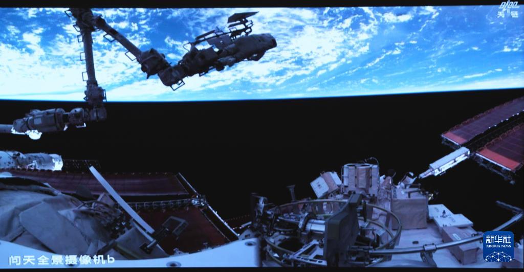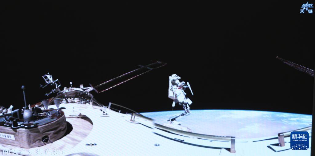 這是8月15日在北京航天飛行控制中心屏幕上拍攝的神舟二十號(hào)乘組航天員陳冬在艙外工作的畫面。新華社記者 厲彥辰 攝