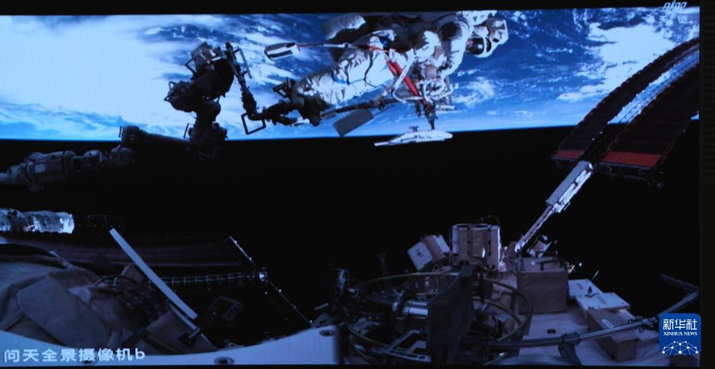 這是8月15日在北京航天飛行控制中心屏幕上拍攝的神舟二十號(hào)乘組航天員陳冬(左)與王杰在艙外工作的畫面(視頻截圖)。新華社記者 殷家捷 攝