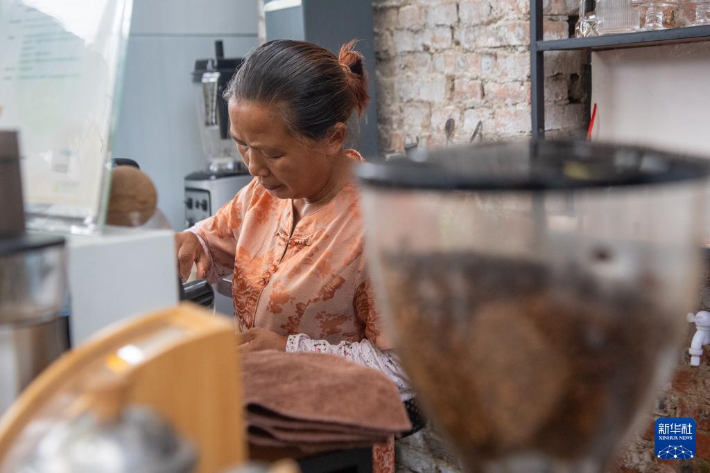 8月15日,在竹山鎮(zhèn)獵神村一處用礦山用房改造的咖啡館內(nèi),工作人員在制作咖啡。