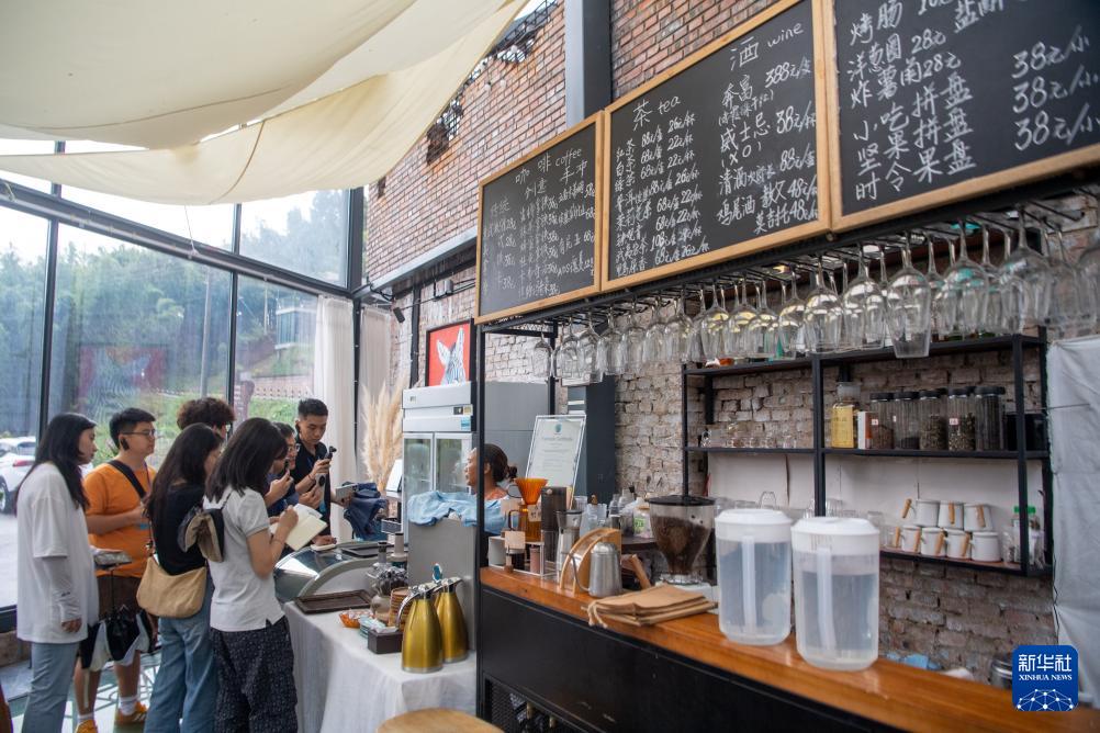 8月15日,在竹山鎮(zhèn)獵神村一處用礦山用房改造的咖啡館內(nèi),工作人員在介紹咖啡產(chǎn)品。