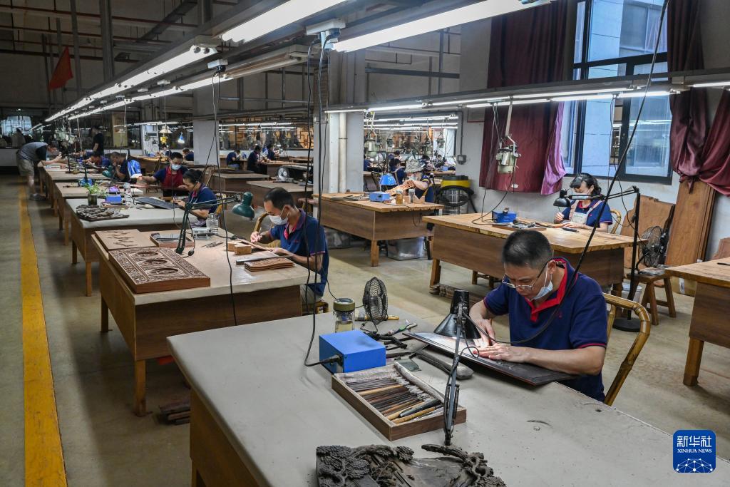 8月18日,工人在莆田仙游三福古典家具有限公司雕刻工藝美術(shù)品。