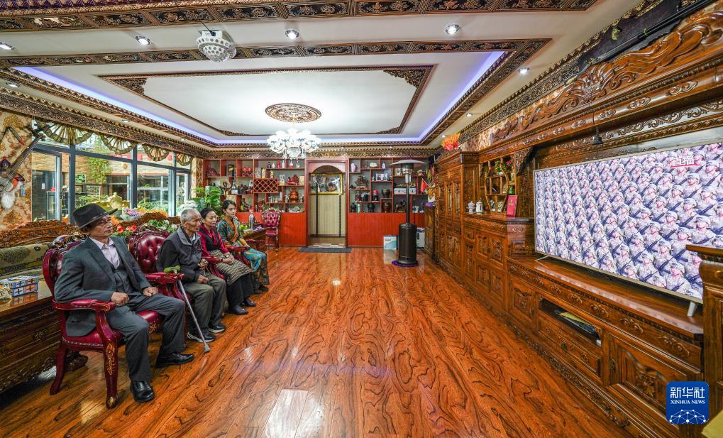 9月3日,西藏拉薩市達(dá)孜區(qū)團(tuán)結(jié)社區(qū)洛追晉美(左二)一家人在觀看紀(jì)念中國人民抗日戰(zhàn)爭暨世界反法西斯戰(zhàn)爭勝利80周年大會直播。