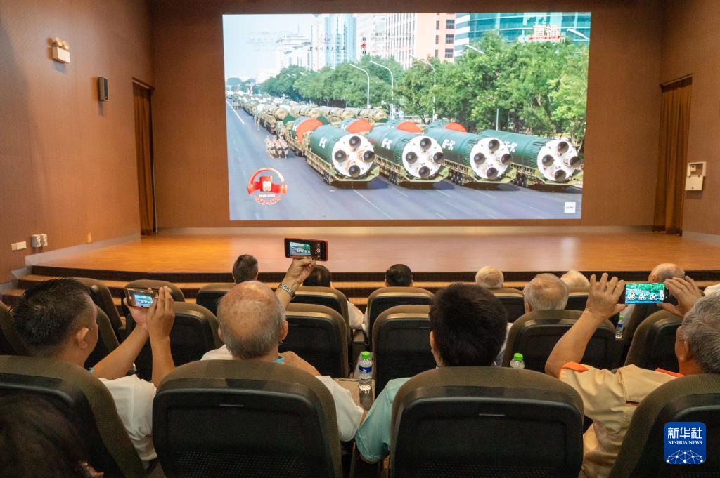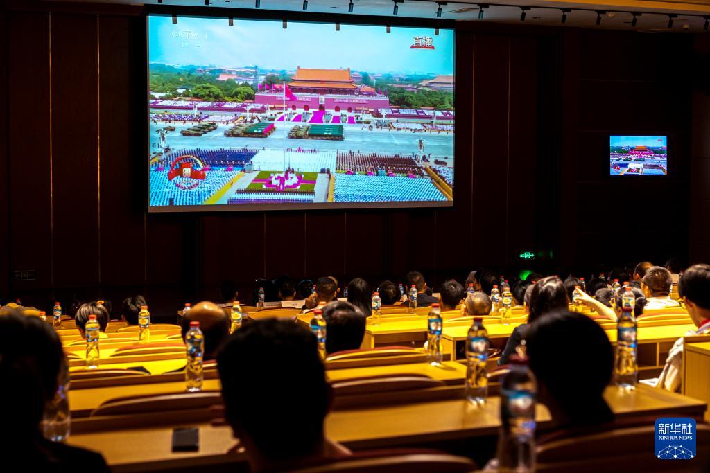 9月3日,在老撾首都萬象,華僑華人及中資企業(yè)代表觀看紀念中國人民抗日戰(zhàn)爭暨世界反法西斯戰(zhàn)爭勝利80周年大會直播。