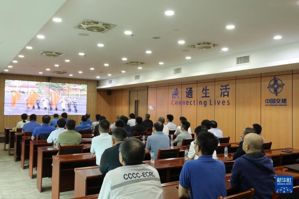9月3日,在馬來西亞吉隆坡,馬來西亞東海岸鐵路項目建設者觀看紀念中國人民抗日戰(zhàn)爭暨世界反法西斯戰(zhàn)爭勝利80周年大會直播。