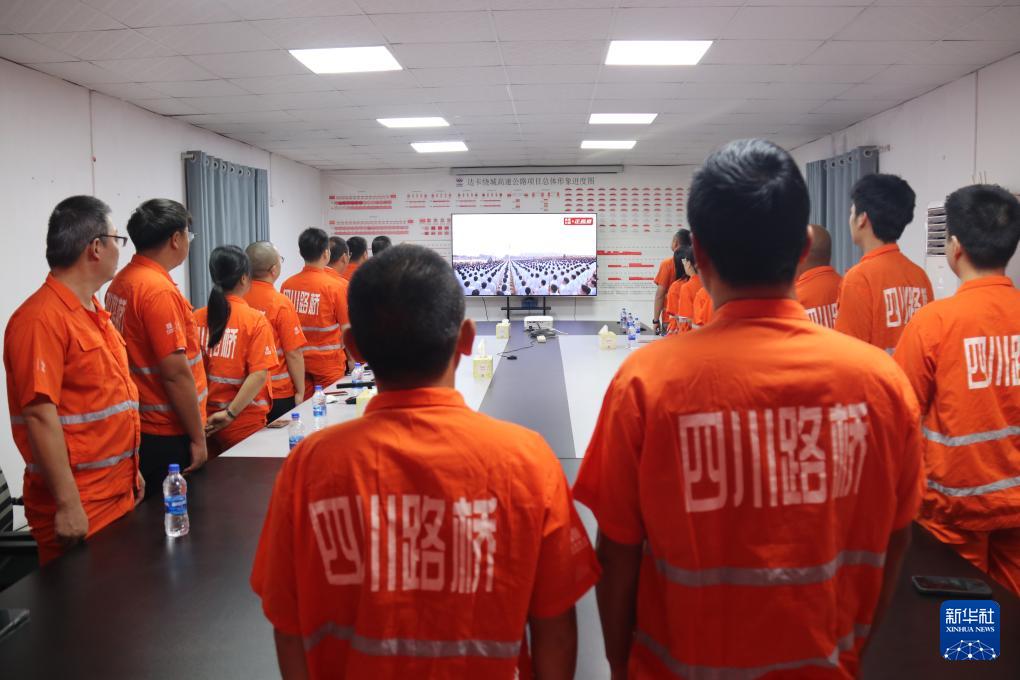 9月3日,在孟加拉國達卡,達卡繞城高速公路項目建設者在駐地觀看紀念中國人民抗日戰(zhàn)爭暨世界反法西斯戰(zhàn)爭勝利80周年大會直播。