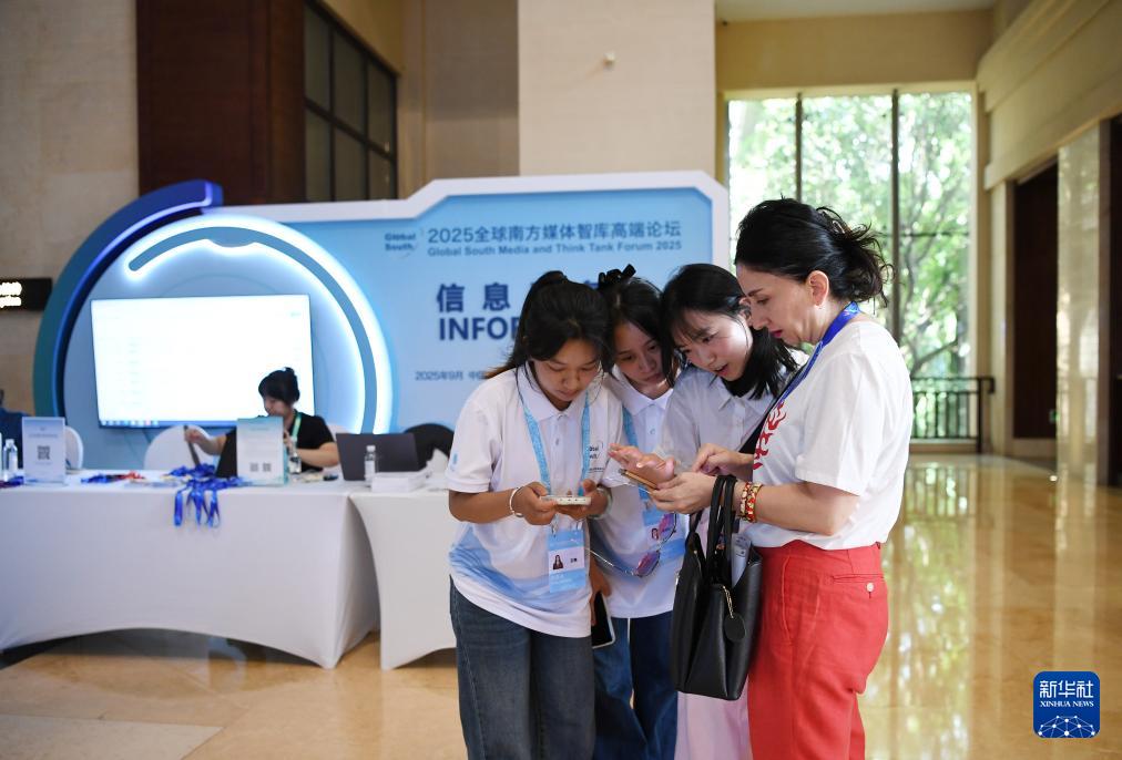 9月5日,出席2025“全球南方”媒體智庫(kù)高端論壇的代表(右一)在信息服務(wù)臺(tái)前咨詢。