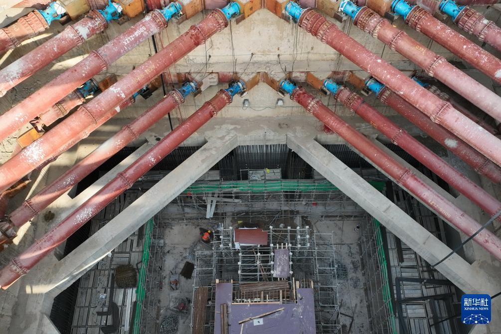 9月7日,工人在石家莊地鐵4號線一期工程東垣東路站建設(shè)工地施工(無人機(jī)照片)。