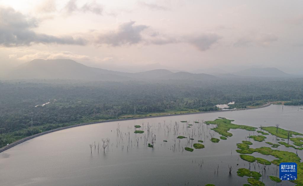 這是在喀麥隆南部大區(qū)拍攝的曼維萊水電站庫區(qū)(無人機(jī)照片,6月29日攝)。