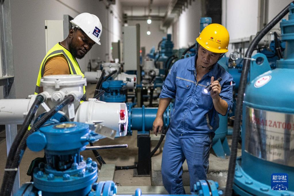 在喀麥隆南部大區(qū)的曼維萊水電站,喀麥隆電力發(fā)展公司工程師恩塔姆·埃馬紐埃爾·圖(左)與中國工程師彭春生進(jìn)行巡檢(6月30日攝)。