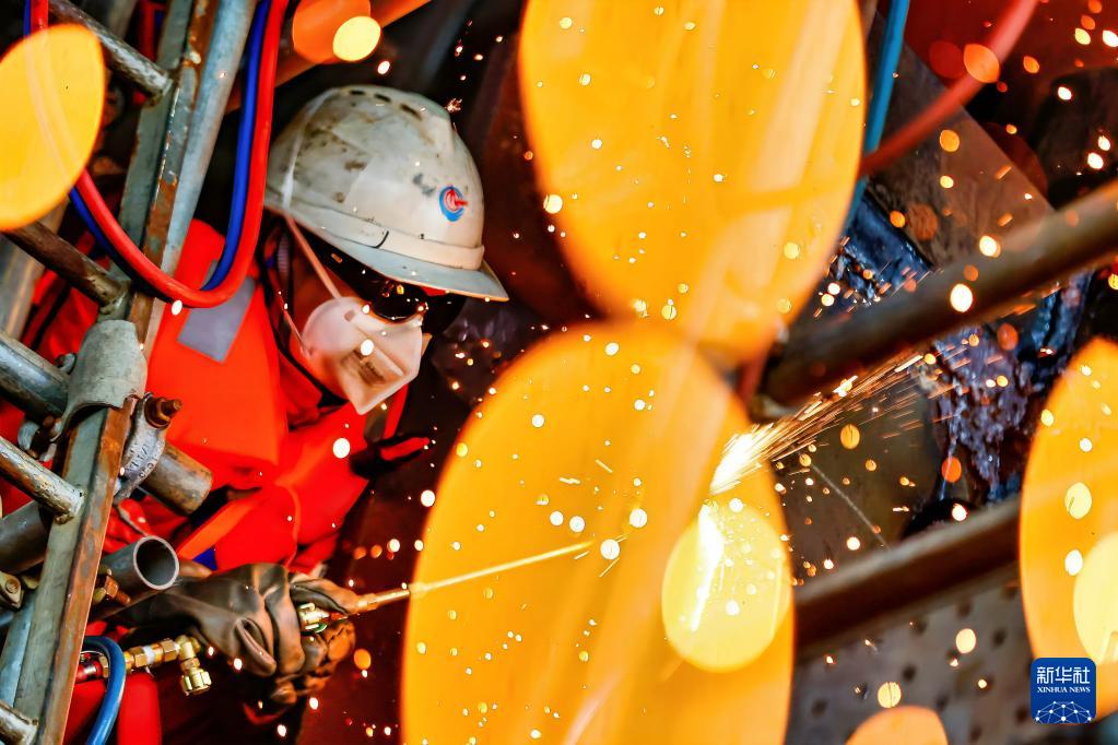 9月8日,工人在墾利6-1油田10-1北區(qū)塊Ⅱ期開發(fā)項(xiàng)目油氣平臺(tái)安裝作業(yè)現(xiàn)場(chǎng)進(jìn)行切割作業(yè)。