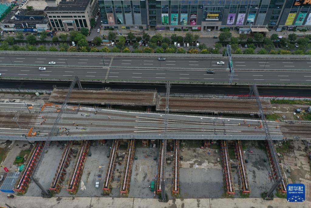 9月10日拍攝的已順利完成頂推橫移換梁施工的浙江紹興城際鐵路柯橋站(無人機(jī)照片)。