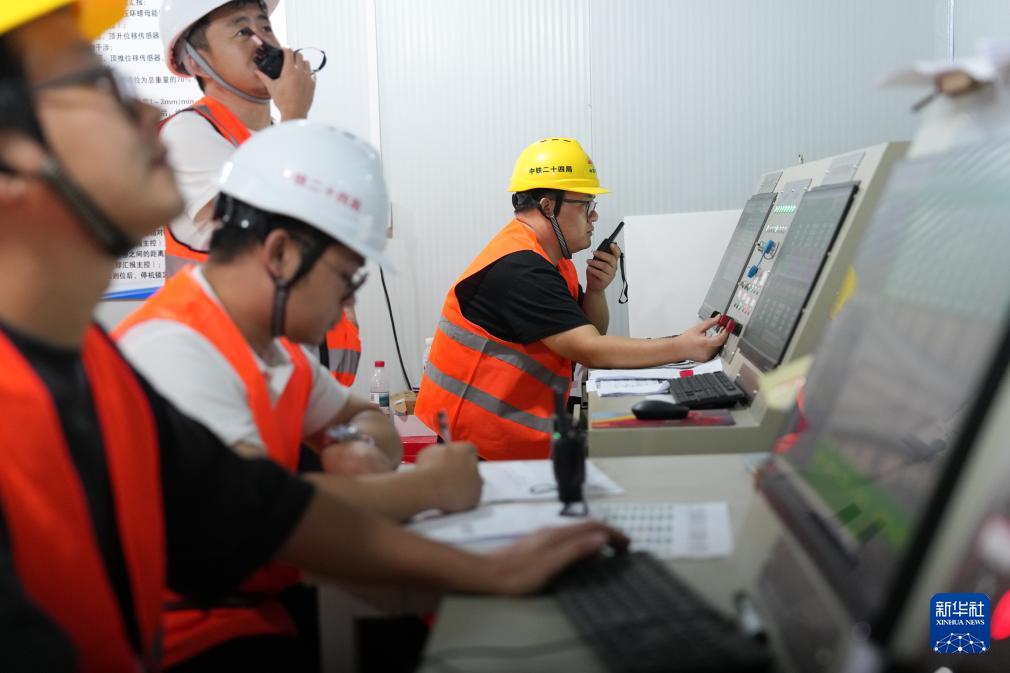9月10日凌晨,工程技術(shù)人員在浙江紹興城際鐵路柯橋站頂推橫移換梁施工現(xiàn)場指揮部實時關(guān)注工程進(jìn)展。