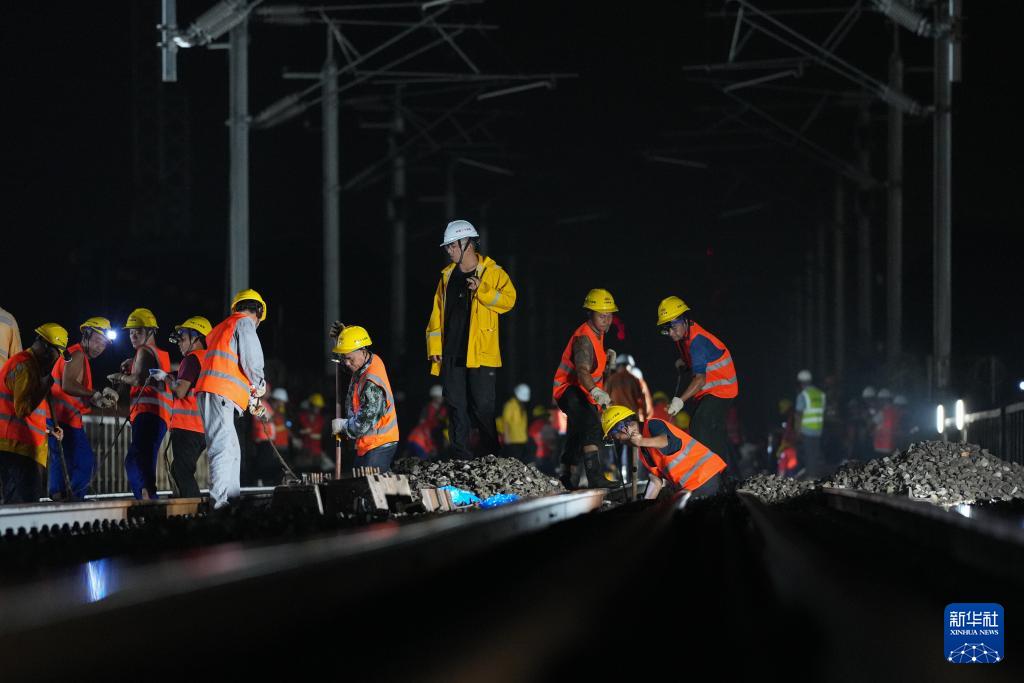 9月10日凌晨,中鐵二十四局建設(shè)者在浙江紹興城際鐵路柯橋站頂推橫移換梁施工現(xiàn)場作業(yè)。