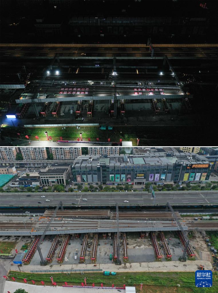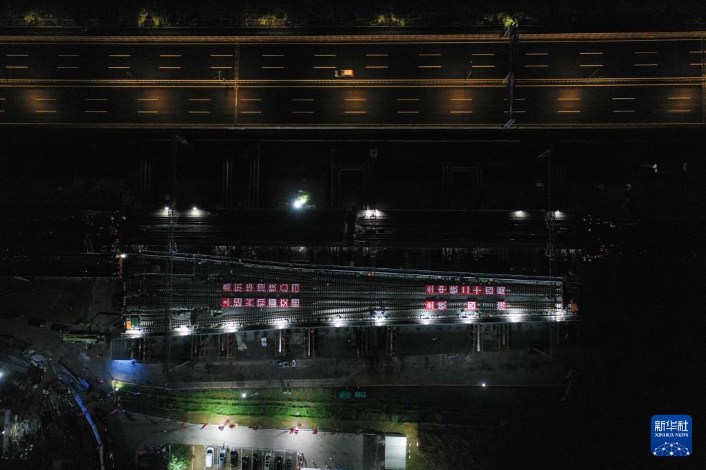 9月10日凌晨拍攝的浙江紹興城際鐵路柯橋站頂推橫移換梁施工現(xiàn)場(無人機(jī)照片)。