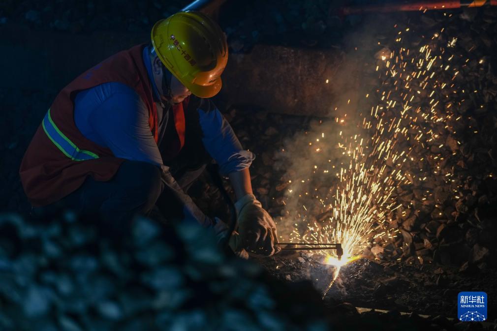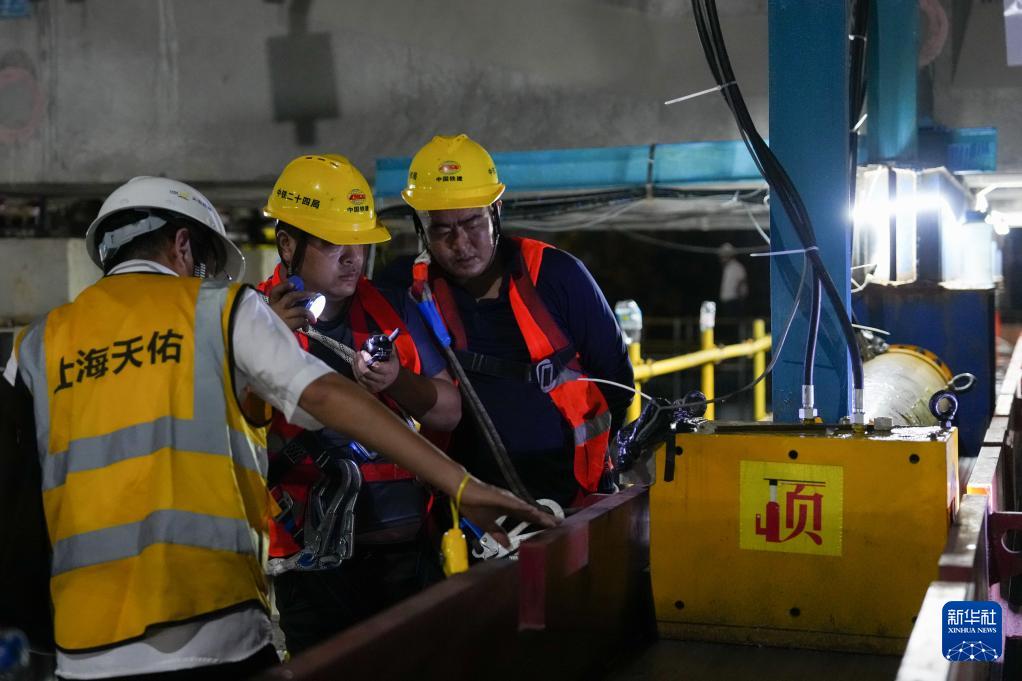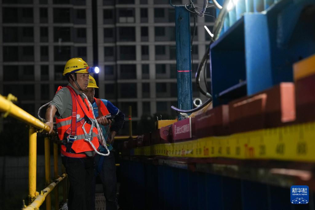 9月10日凌晨,工程技術(shù)人員在浙江紹興城際鐵路柯橋站頂推橫移換梁施工現(xiàn)場關(guān)注設(shè)備運行情況。
