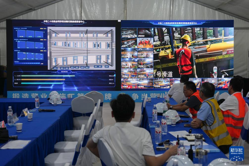 9月10日凌晨,中鐵二十四局工程技術(shù)人員在浙江紹興城際鐵路柯橋站頂推橫移換梁施工控制中心調(diào)度指揮。
