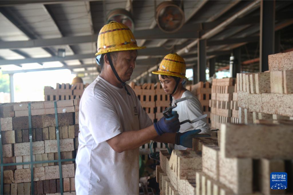 在福州閩侯縣一家建筑垃圾資源化利用企業(yè)的生產(chǎn)園區(qū),一批建筑垃圾制作的磚塊燒制完成,工人們在篩選、捆扎(9月13日攝)。