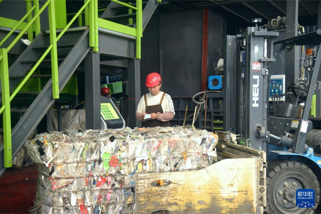 在位于福州馬尾區(qū)的福州城投再生資源分揀中心,工人為分揀后壓縮的可回收垃圾稱重(9月13日攝)。