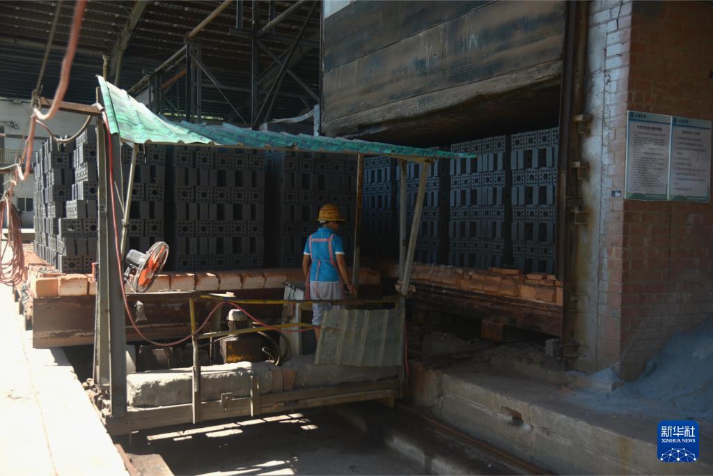 在福州閩侯縣一家建筑垃圾資源化利用企業(yè)的生產(chǎn)園區(qū),工人將一批由建筑垃圾制作的磚坯送入焙燒設(shè)備(9月13日攝)。