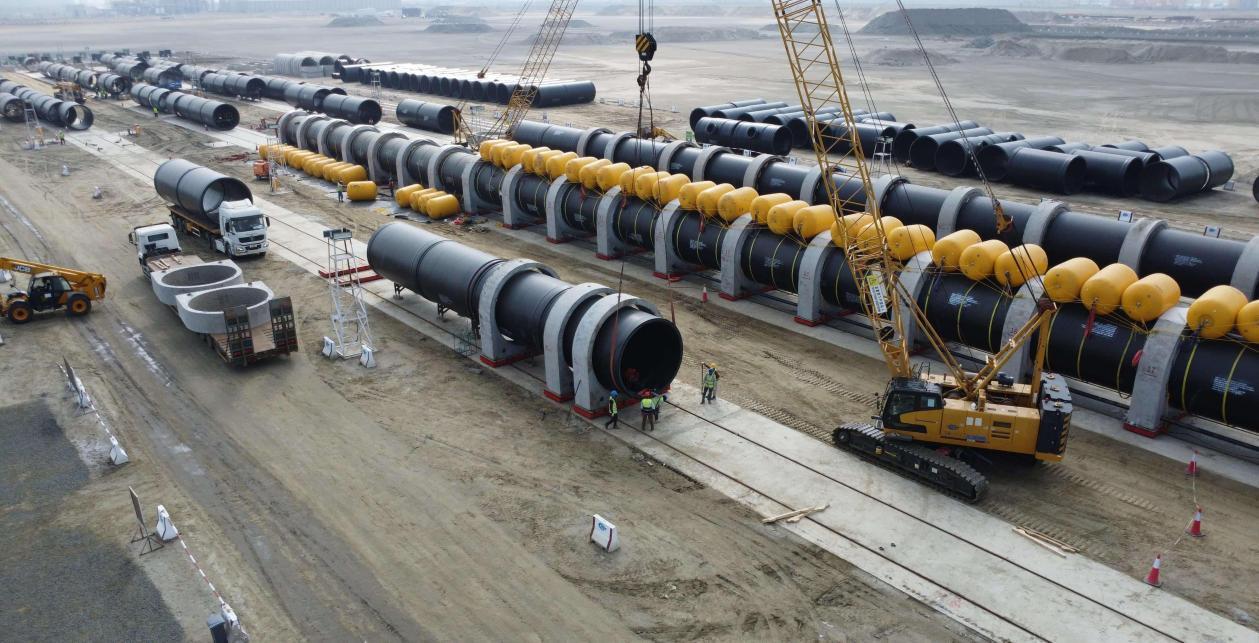 在紅海海岸線上的管道預制場,一條條巨型HDPE管道靜靜地排列在場地之中,等待著被拖運入海的那一刻。“呲呲”的電火花聲下,產(chǎn)業(yè)工人們正為直徑3.5米、重達數(shù)十噸的管道進行焊接作業(yè)。