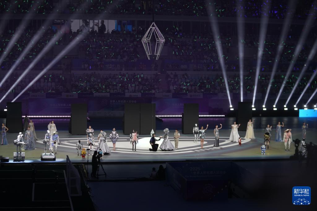 歌舞節(jié)目《歡迎來到碳基生命的世界》中,人類舞者與機器人以流暢協(xié)作演繹“碳基與硅基的對話”;服飾走秀節(jié)目《天工霓裳》則將非遺技藝與未來設(shè)計完美融合……14日的開幕式上,超百支戰(zhàn)隊閃耀“冰絲帶”,各式機甲競展風(fēng)采,機器人街舞、戲曲輪番登場,更與專業(yè)街舞團聯(lián)袂獻藝,生動演繹科技與人類文明的碰撞交融。隨著舞臺中央的“智芯”裝置——鑲嵌藍色晶體芯片的金屬四棱錐被點亮,2025世界人形機器人運動會正式啟動。