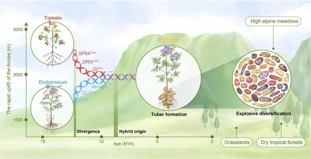 7月31日,中國(guó)農(nóng)業(yè)科學(xué)院深圳農(nóng)業(yè)基因組研究所(嶺南現(xiàn)代農(nóng)業(yè)科學(xué)與技術(shù)廣東省實(shí)驗(yàn)室深圳分中心)黃三文團(tuán)隊(duì)聯(lián)合國(guó)內(nèi)外研究機(jī)構(gòu)首次揭示了茄屬馬鈴薯組(Solanum section Petota)的雜交起源、薯塊形成和輻射分化。該研究是“優(yōu)薯計(jì)劃”的又一重大突破,為馬鈴薯育種改良提供了全新的理論視角。相關(guān)研究成果發(fā)表在《細(xì)胞(Cell)》上。