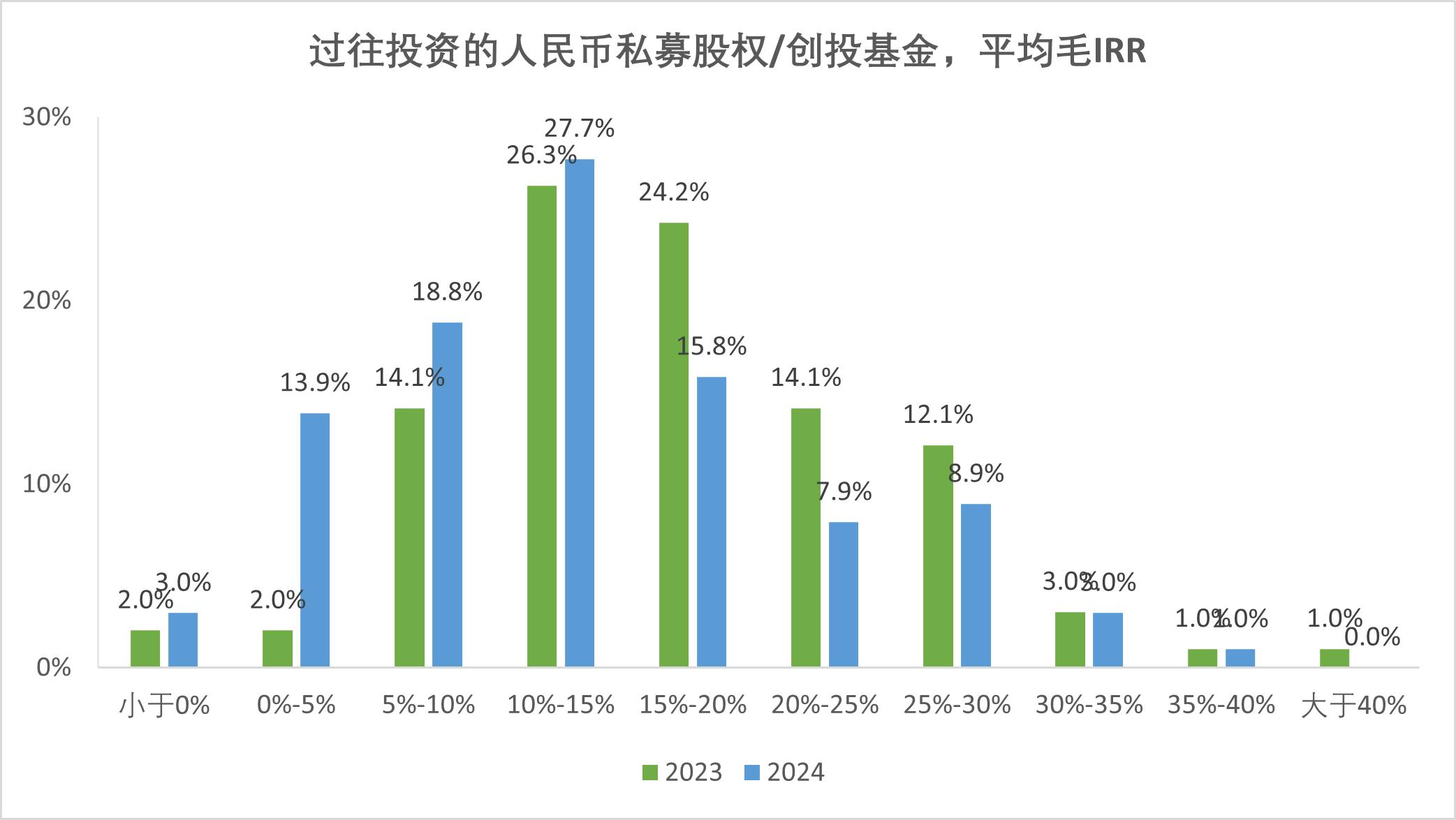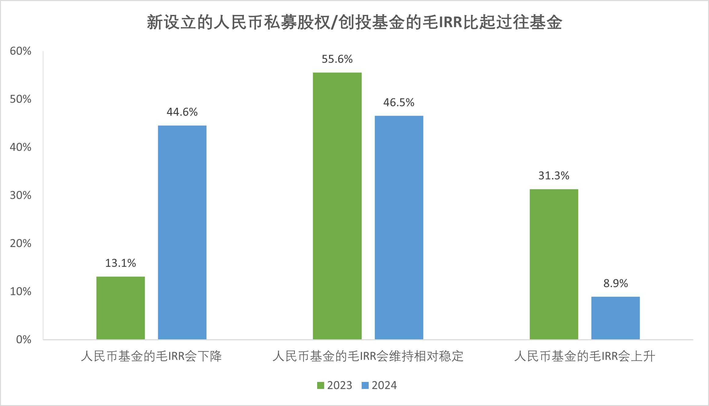 調(diào)研結(jié)果顯示,IRR主要集中在5%-20%區(qū)間(63.4%),仍有16.8%的機(jī)構(gòu)IRR低于5%,人民幣基金業(yè)績分化明顯;44.6%預(yù)測新基金IRR將下降。