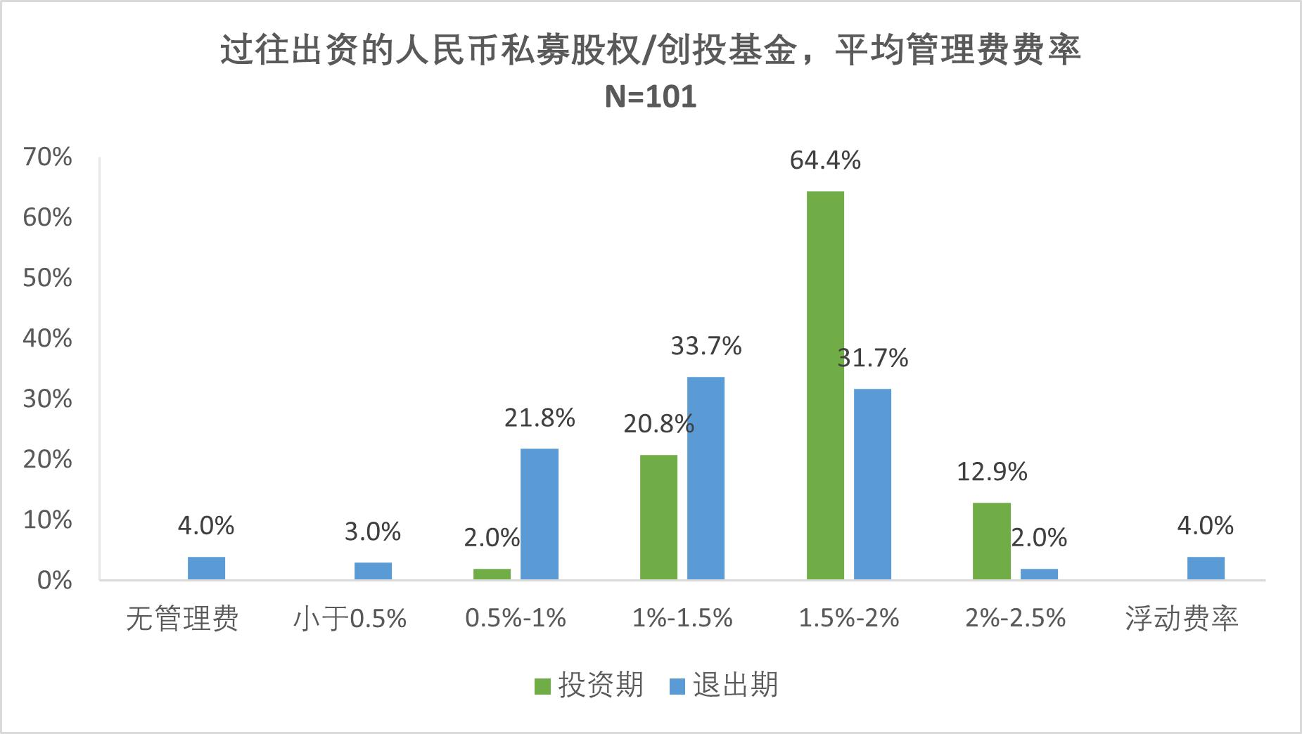 調(diào)研結(jié)果顯示,近七成(69.3%)機(jī)構(gòu)按實(shí)繳規(guī)模收1.5%-2%管理費(fèi),退出期轉(zhuǎn)未退出本金基數(shù)(54.5%)且費(fèi)率降至0.5%-1.5%,體現(xiàn)“按實(shí)際服務(wù)收費(fèi)”原則,84.2%的LP認(rèn)可現(xiàn)行水平;近六成(54.5%)機(jī)構(gòu)設(shè)7%-8%門檻收益,超六成(64.1%)機(jī)構(gòu)配追補(bǔ)機(jī)制,超額分成15%-20%成主流,超七成(71.3%)機(jī)構(gòu)采用歐式瀑布分配,為“本金安全墊+超額激勵(lì)”的經(jīng)典架構(gòu)。人民幣VC/PE市場費(fèi)用與分配機(jī)制已形成高度標(biāo)準(zhǔn)化體系,體現(xiàn)出風(fēng)險(xiǎn)共擔(dān)、績效導(dǎo)向的成熟市場特征。