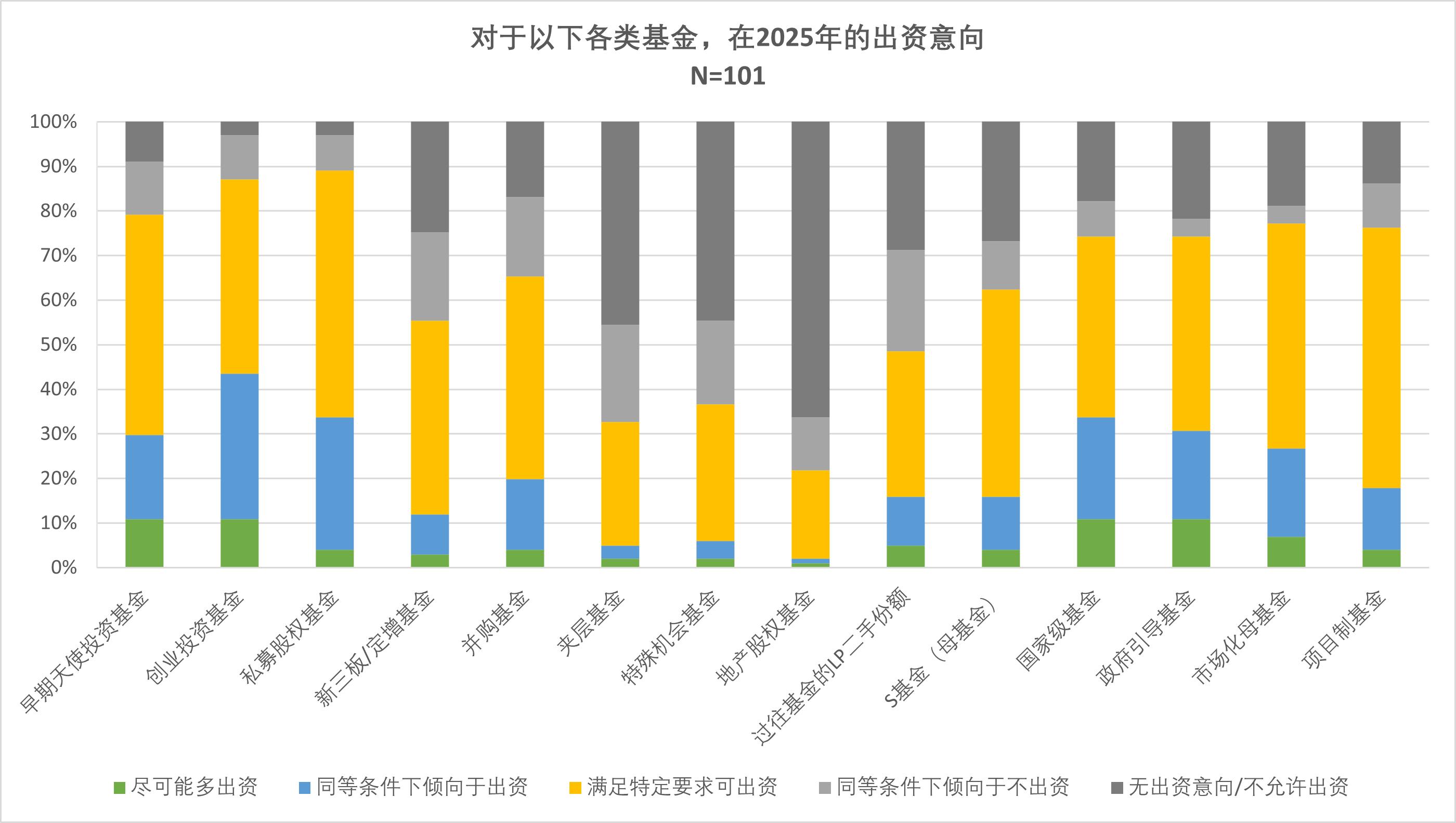 本次調(diào)研問卷題目共101題,涵蓋了政府引導(dǎo)基金、央企/國企、險(xiǎn)資、家族辦公室等101家機(jī)構(gòu)LP。以下為調(diào)研結(jié)果發(fā)現(xiàn):