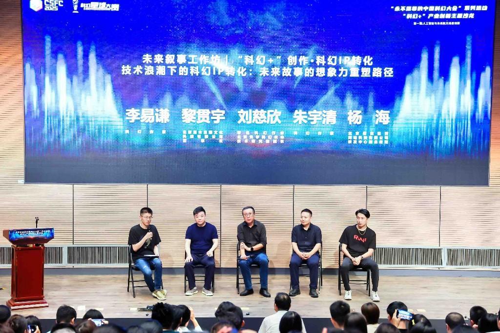 第二場(chǎng)圓桌論壇主題為“技術(shù)浪潮下的科幻IP轉(zhuǎn)化:未來(lái)故事的想象力重塑路徑”,由科幻作家李易謙主持??苹米骷抑煊钋?、北京灌木互娛文化科技有限公司董事長(zhǎng)黎貫宇、北京儒意景秀網(wǎng)絡(luò)科技有限公司研發(fā)中心副總經(jīng)理?xiàng)詈Ec劉慈欣一起,圍繞科幻文學(xué)創(chuàng)作和IP轉(zhuǎn)化等內(nèi)容展開(kāi)深入探討。