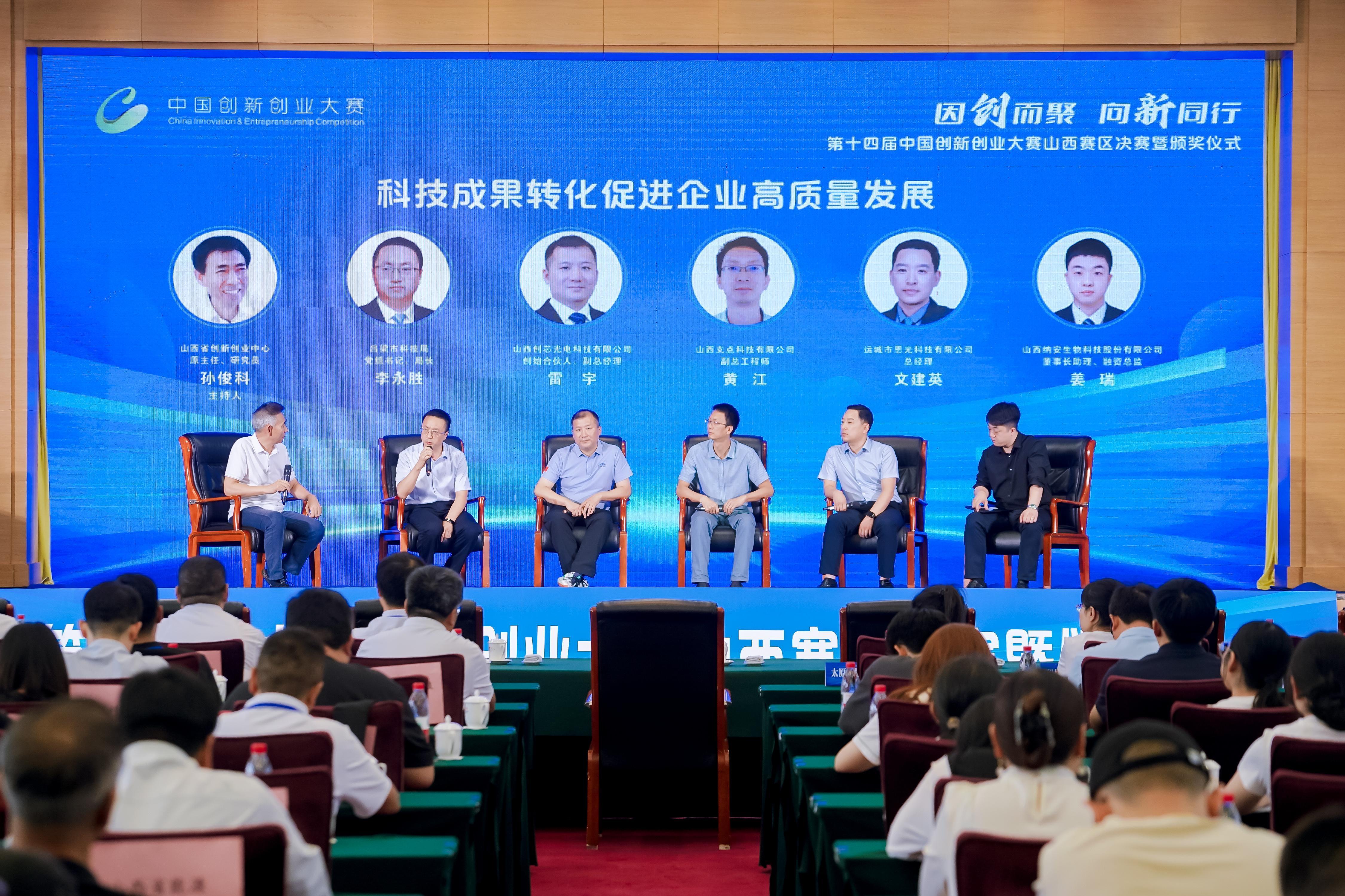 當(dāng)天,就科技成果轉(zhuǎn)化促進(jìn)企業(yè)高質(zhì)量發(fā)展舉辦了創(chuàng)業(yè)分享圓桌對(duì)話討論會(huì)。山西賽區(qū)組委會(huì)邀請(qǐng)呂梁市科學(xué)技術(shù)局局長(zhǎng)李永勝、參賽各領(lǐng)域優(yōu)秀企業(yè)代表分別進(jìn)行了激情熱烈的科技創(chuàng)新政策宣講和創(chuàng)業(yè)感悟分享。決賽期間,還舉行了以“科技創(chuàng)新與產(chǎn)業(yè)創(chuàng)新深度融合”為主題的高峰論壇。