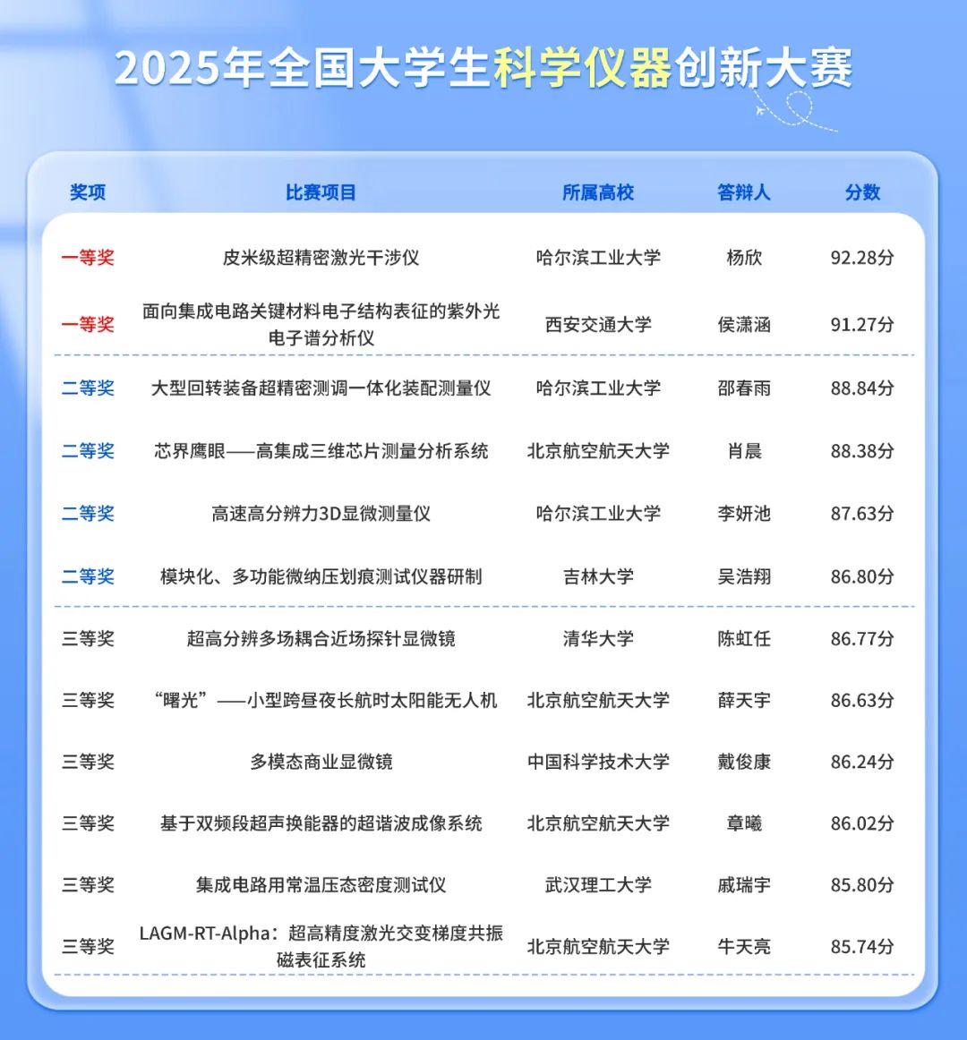 8月13日,2025年全國(guó)大學(xué)生科學(xué)儀器創(chuàng)新大賽決賽在京舉辦。經(jīng)過激烈角逐,“皮米級(jí)超精密激光干涉儀”“面向集成電路關(guān)鍵材料電子結(jié)構(gòu)表征的紫外光電子譜分析儀”“芯界鷹眼——高集成三維芯片測(cè)量分析系統(tǒng)”等12個(gè)項(xiàng)目脫穎而出,獲得本屆大賽一、二、三等獎(jiǎng)。