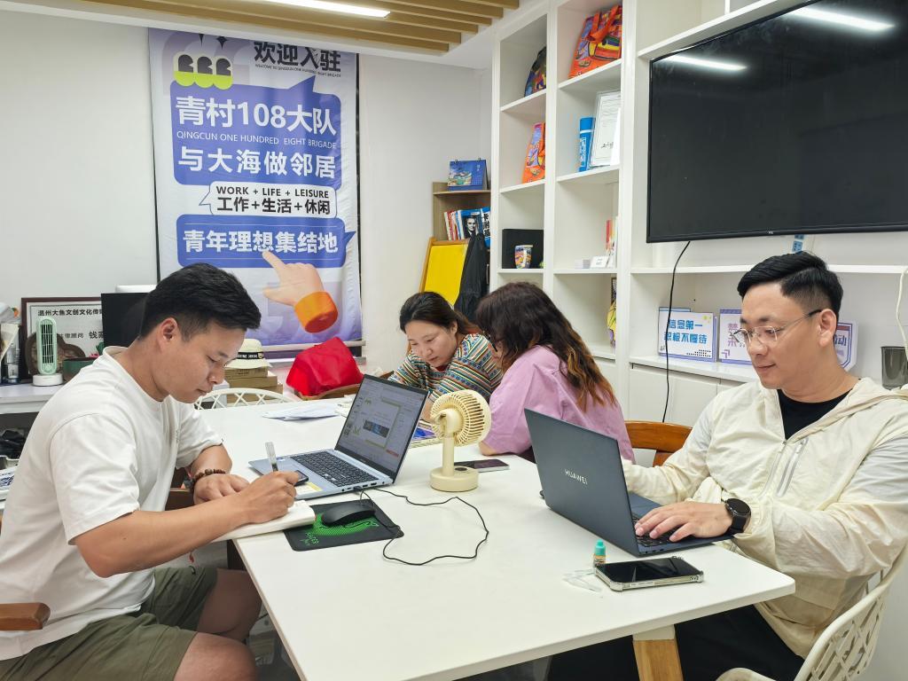 2025年6月25日,在浙江省溫州市洞頭區(qū)東屏街道東岙村,一群創(chuàng)業(yè)青年在“青村108大隊”海創(chuàng)空間內(nèi)工作。新華社記者 王俊祿 攝