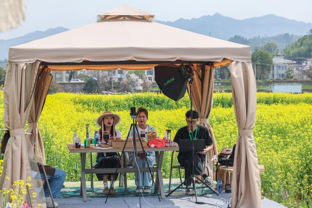 2025年3月23日,主播在浙江省建德市更樓街道城南城市田園油菜花田邊的直播間內(nèi)推介當?shù)匚穆庙椖俊P氯A社記者 徐昱 攝