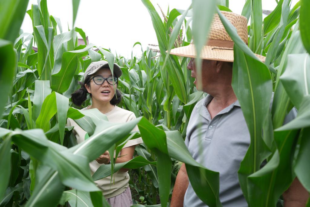 2025年7月17日,在浙江省臺州市椒江區(qū)下陳街道橫河陳村,青年創(chuàng)業(yè)者陳艷(左)在她開設(shè)的觀光農(nóng)場內(nèi)和本地農(nóng)民討論莊稼長勢。新華社記者 翁忻旸 攝