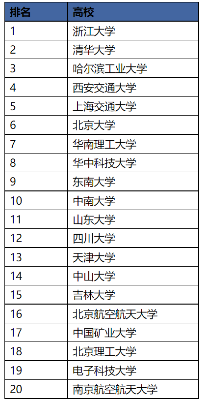 在專利申請方面,近三年,高校50強每年的專利申請量超過16萬件、專利授權量超過10萬件,專利申請量和授權量總體呈波動趨勢。高校50強中,80%的高校專利申請量超過6000件,其中接近40%的高校專利申請量超過10000件且授權量超6000件。研發(fā)聚焦行業(yè),針對儀器儀表制造業(yè)領域的專利數(shù)量最多,其次是金屬制品、機械和設備修理業(yè),專用設備制造業(yè)以及計算機、通信和其他電子設備制造業(yè)。