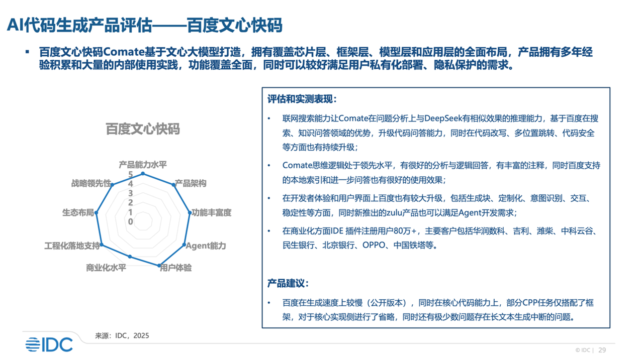 IDC指出,聯(lián)網(wǎng)搜索能力讓文心快碼在問題分析上與DeepSeek有相似效果的推理能力,基于百度在搜索、知識(shí)問答領(lǐng)域的優(yōu)勢(shì),升級(jí)代碼問答能力,同時(shí)在代碼改寫、多位置跳轉(zhuǎn)、代碼安全等方面也有持續(xù)升級(jí);文心快碼的思維邏輯處于領(lǐng)先水平,有很好的分析與邏輯回答,有豐富的注釋,同時(shí)文心快碼支持的本地索引和進(jìn)一步問答也有很好的使用效果;在用戶體驗(yàn)和用戶界面上文心快碼也有較大升級(jí),包括生成塊、定制化、意圖識(shí)別、交互、穩(wěn)定性等方面,同時(shí)新推出的zulu產(chǎn)品也可以滿足Agent開發(fā)需求。