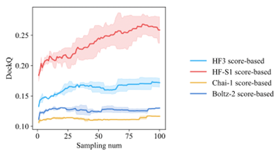 得益于接觸感知采樣策略,HelixFold-S1在性能上實(shí)現(xiàn)了突破性提升。在實(shí)際測試中,HelixFold-S1普遍比前代模型表現(xiàn)更好,在較難的抗原抗體場景上提升尤為明顯,實(shí)測數(shù)據(jù)顯示,對比base版本,HelixFold-S1在該場景下預(yù)測精度提升58%,對比Chai-1和Boltz-2分別提升80%和56%。同時,隨著取樣步數(shù)的增加,HelixFold-S1獲取更優(yōu)質(zhì)構(gòu)象的概率也在不斷增加,相比其他方法提升空間更顯著。