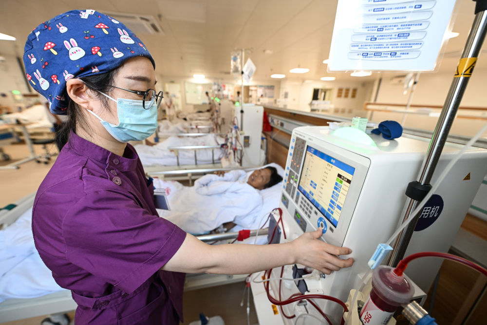 江蘇海安市曲塘中心衛(wèi)生院護(hù)士在血液透析中心操作設(shè)備(2024年7月31日攝)。海安加快優(yōu)質(zhì)醫(yī)療資源下沉,對(duì)基層醫(yī)療機(jī)構(gòu)管理、技術(shù)等方面進(jìn)行幫扶。數(shù)據(jù)顯示,2023年海安市縣域內(nèi)就診率為90.54%,基層醫(yī)療衛(wèi)生機(jī)構(gòu)門(mén)急診占比為74.86%。新華社記者 季春鵬 攝